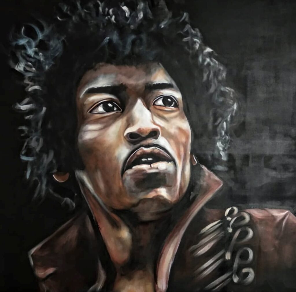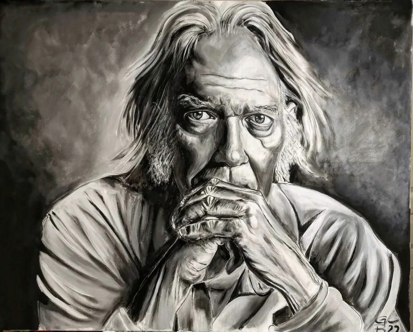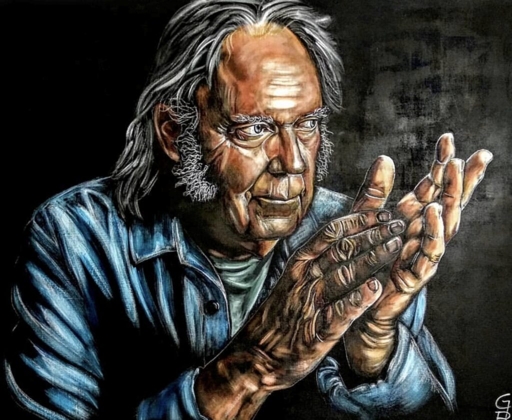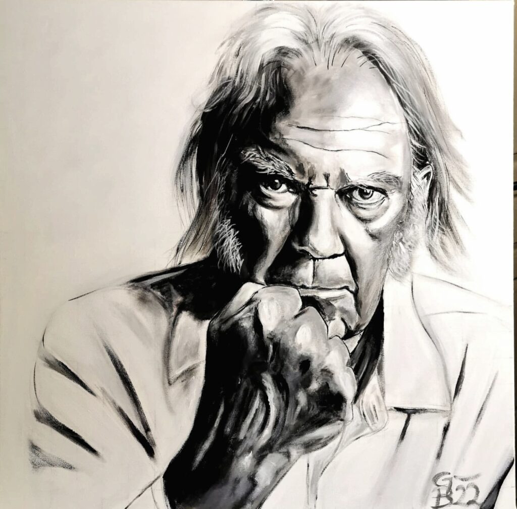 Neil Young, acrylic and charcoal on canvas, 100×125, 2022